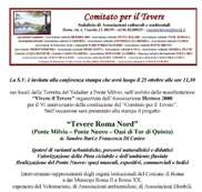 Il Comitato per il Tevere, sodalizio di associazioni culturali ed ambientali (mail comitatotevere@tiscali.it), comunica che il 25 Ottobre alle ore 11.30, nei locali della Torretta Valadier di Ponte Milvio, nell’ambito delle manifestazioni “Vivere il Tevere” organizzate dall’Associazione Hermes 2000 per il VI anniversario della costituzione del “Comitato per il Tevere” si terrà la conferenza stampa per la presentazione del progetto “Tevere Roma Nord” (Ponte Milvio – Ponte Nuovo – Oasi di Tor di Quinto) ideato e redatto da Sandro Bari e Francesca Di Castro.