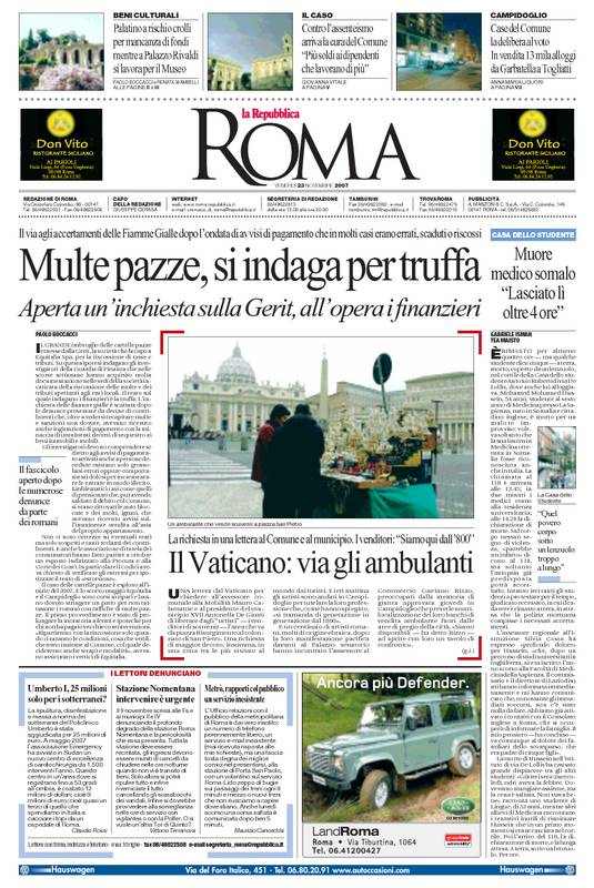 copertina_rm_locali_w540.jpgSpicca la notizia sulle prime pagine delle cronache romane dei quotidiani di oggi: sulla base dell’ipotesi di reato di truffa la Guardia di Finanza ha aperto un’indagine sul caso delle “multe pazze”, risalenti anche a dieci anni fa, notificate dalla Gerit SpA negli ultimi mesi a migliaia di cittadini romani.
