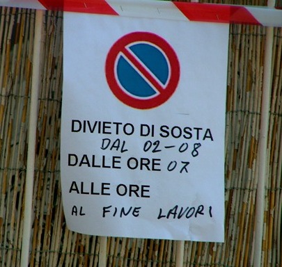 via-nemea-7208-1441.jpge dunque la ditta esecutrice si è diligentemente adoperata in tal senso ed ha provveduto a stendere per tutta via Nemea i classici bandoni bianco-rossi appendendo agli stessi gli avvisi di segnalazione del divieto di sosta.  Peccato che non abbia avuto voglia o tempo di compilarli ad hoc ed abbia invece riciclato dei vecchi foglietti già usati… già, perché i fogli appesi per tutta via Nemea dicono, come dimostrato da queste foto, “divieto di sosta dal 2 Agosto a fine lavori“.