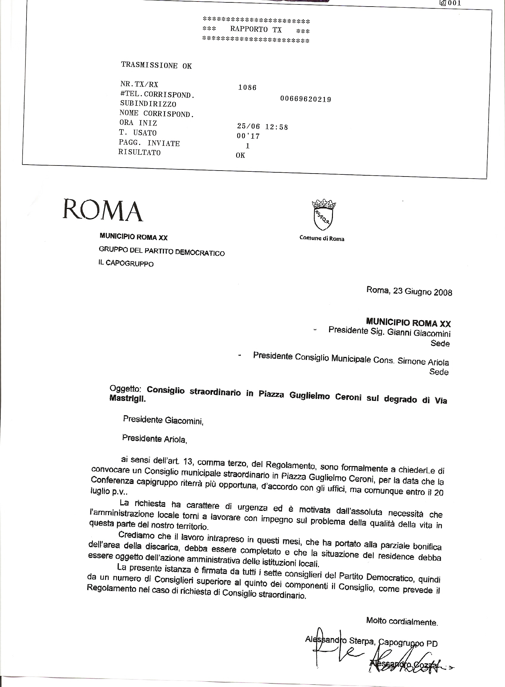 Cari amici, vi informo che, ai sensi del Regolamento Municipale, il gruppo PD compatto ha chiesto formalmente al Presidente del XX Municipio, Gianni Giacomini, ed al Presidente del Consiglio Municipale, Simone Ariola, di convocare entro il 20 Luglio un consiglio straordinario in piazza Guglielmo Ceroni (inizio via Mastrigli) dedicato interamente al tema della discarica e del residence.