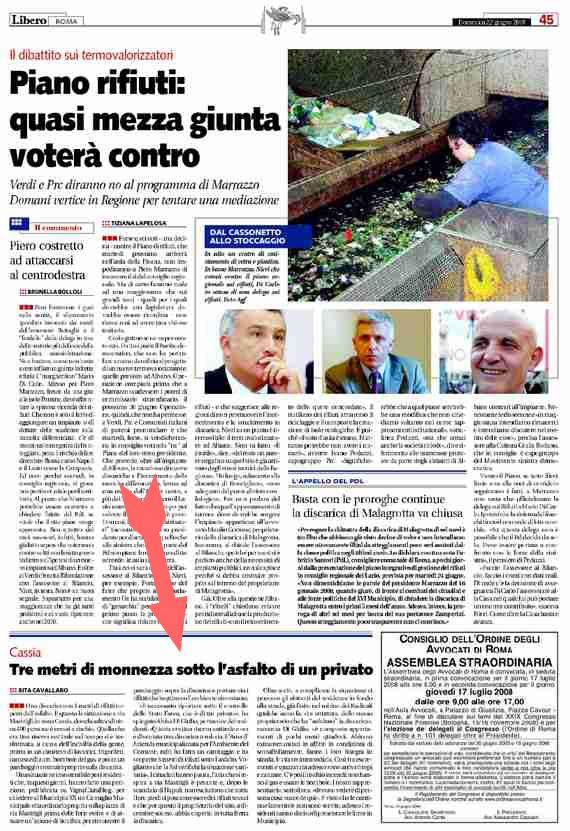 libero-22608.jpgIl quotidiano Libero, nella sua edizione del 22 Giugno, si è occupato di Via Mastrigli e della petizione lanciata dal Comitato Cittadini Villaggio dei Cronisti e da VignaClaraBlog per richiamare l’attenzione delle istituzioni locali. Dall’articolo di Rita Cavallaro  estraiamo alcuni salienti passaggi ” …Una discarica con 3 metri di rifiuti coperti dall’asfalto. È questa la situazione a via Mastrigli, in zona Cassia, dove la salute di circa 400 persone è ormai a rischio. Quella che era una riserva naturale nel tempo si è trasformata, a causa dell’inciviltà della gente, prima in un cimitero di lavatrici, frigoriferi, carcasse di auto, bombole del gas, e poi in un parcheggio costruito proprio sulla discarica.