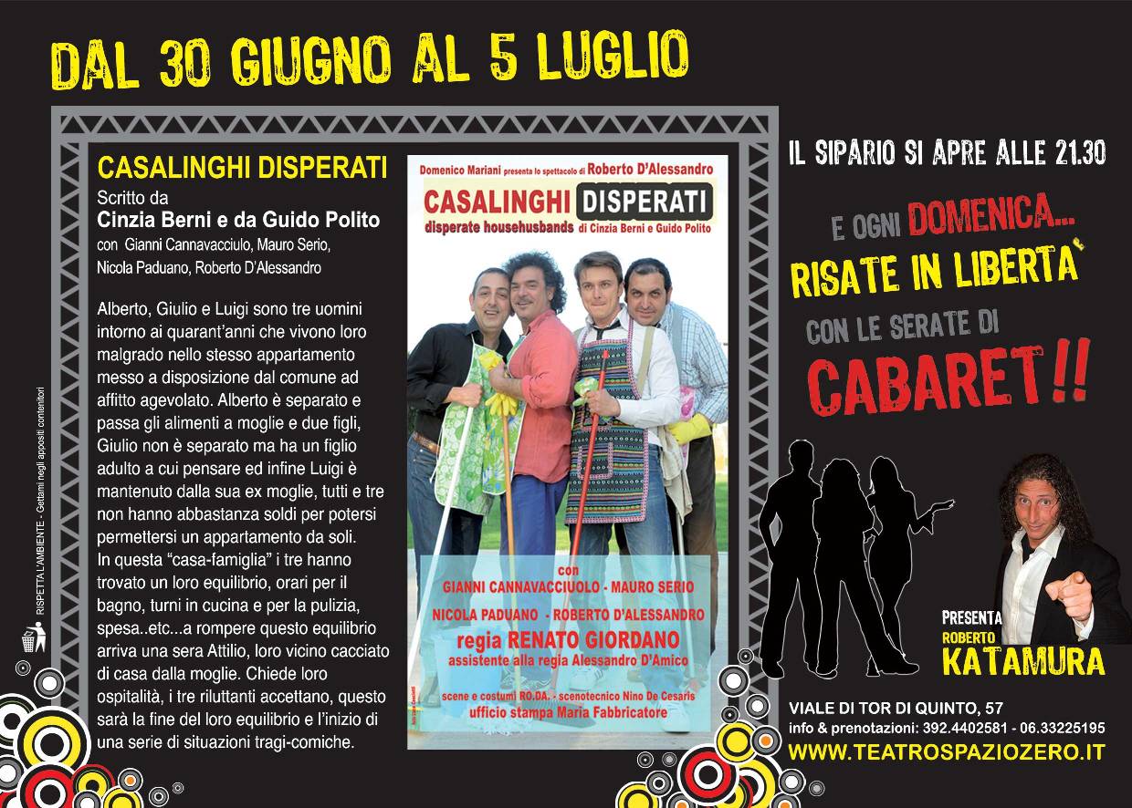Versione maschile e italiana della celebre fiction statunitense Desperate housewivers, va in scena al nuovo teatro Spazio Zero Village Casalinghi Disperati, parodia di Roberto D’Alessandro, Cinzia Berni e Guido Polito che dipinge il modus vivendi di una nuova categoria sociale, i “padri invisibili” che rivendicano il proprio ruolo. Alberto, Giulio e Luigi sono tre quarantenni che convivono in un appartamento ad affitto agevolato, visto che nessuno di loro può permettersi una casa tutta per sè. Ognuno, in compenso, ha il proprio fardello (economico più che sentimentale) ereditato dal passato…. Alberto è separato, quindi deve dare gran parte dello stipendio per il mantenimento della moglie e dei due figli, Giulio ha un figlio grande a carico mentre Luigi è talmente “scannato” che viene mantenuto dalla ex compagna. In questa “comune” i tre trovano un equilibrio, in cui fanno combaciare tutte la esigenze, dagli orari per il bagno al lavaggio dei piatti. Finchè arriva anche Attilio a cercare asilo, cacciato di casa dalla moglie, e finisce la pace….