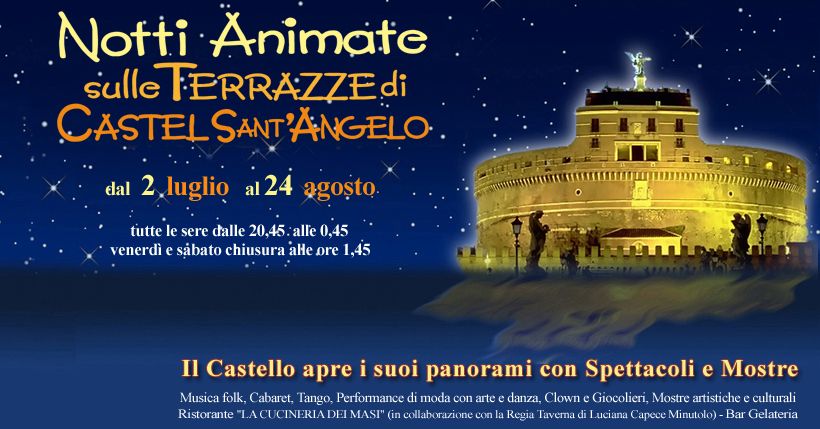 In programma concerti live, esibizioni di danza, teatro, visite serali delle carceri del Castello, mentre sarà riaperto ai visitatori il Passetto di Borgo, il corridoio che collega Castel Sant’Angelo ai Palazzi Vaticani, diventato famoso anche per i romanzi di Dan Brown. E poi spettacoli a volontà con musica etnica e folk sul palco sotto l’Angelo, cabaret nel Cortile della Balestra, arte, moda e danza sul Bastione San Luca e, per i più piccoli, clown, giocolieri, prestigiatori e trampolieri nel Bastione San Marco.