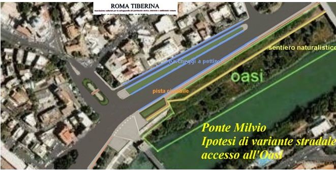 “Cari Curatori di VignaClaraBlog, vi invio uno stralcio dal progetto Tevere Roma Nord, realizzato dalla Associazione Roma Tiberina e dal Comitato per il Tevere, presieduto da Sandro Bari, che riguarda la sistemazione di massima della piazza di Ponte Milvio e del parcheggio, come si evince dalla foto seguente.