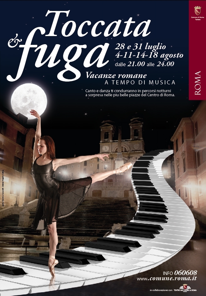 Piazza di Spagna, piazza del Popolo, piazza Farnese e piazza Navona, quattro tra le più belle piazze romane ospiteranno per sei notti, al chiaro di luna, “Toccata e Fuga”, un’originale rassegna di musica, canto e danza by night promossa dall’Assessorato al Turismo del Comune di Roma con il Teatro dell’Opera.