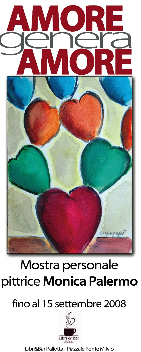 amore-genera-amore.jpgAmore genera amore, l’amore non conosce distinzione di razza, colore di pelle, religione e politica. Questo il leit-motiv della mostra di Monica Palermo che si tiene fino al 15 Settembre presso Libri&Bar Pallotta di Piazza Ponte Milvio. E’ una mostra di 15 formati in acquarello e tempera, 15x15cm, piccoli nelle dimensioni ma grandi per la poesia dei contenuti. Un appuntamento culturale interessante, come tutti gli altri organizzati da Valeria e Carmelo di Libri&Bar Pallotta, una mostra da non farsi sfuggire, anche per non perdere l’occasione di conoscere di persona l’autrice Monica Palermo, in arte Emmepi.