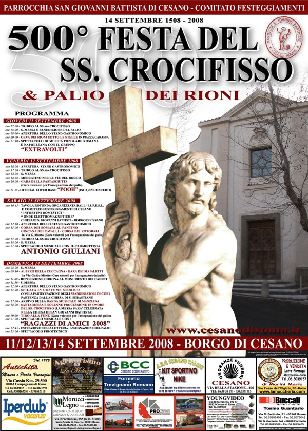 Quest’anno, da Giovedì 11 a Domenica 14 Settembre,nell’antico borgo di Cesano si celebrerà il 500° anniversario del ritrovamento della reliquia ed i Cesanesi sono ansiosi di festeggiare questa particolare data che costituisce un traguardo importante per la storia di questa Comunità. Ecco il programma: