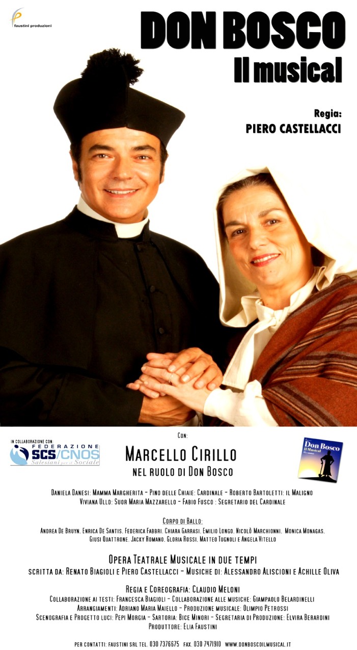 Ma la rappresentazione sarà anche l’occasione “per fare un piccolo regalo a quei ragazzi che a don Bosco stavano tanto a cuore”. Parte del ricavato della vendita dei biglietti del debutto, infatti, andrà alle Case famiglia salesiane del Lazio federate alla Scs (Salesiani per il sociale), Provvidenza e Borgo Ragazzi don Bosco. “Il teatro – concludono gli organizzatori – si riconferma non solo mezzo di diffusione di cultura, svago e intrattenimento, ma anche strumento per sensibilizzare sui problemi dei ragazzi in condizioni di disagio e marginalità e per fare qualcosa di concreto”. Sull’esempio di don Bosco, un sacerdote di strada semplice, che viveva in mezzo alla gente, educava i giovani ai valori per sottrarli alla “malavita”. “Un operario di Dio”, come recita il titoloni uno dei brani più importanti del musical. Nei panni del santo torinese uno straordinario Marcello Cirillo, cantante e presentatore televisivo in “Mezzogiorno in famiglia”.