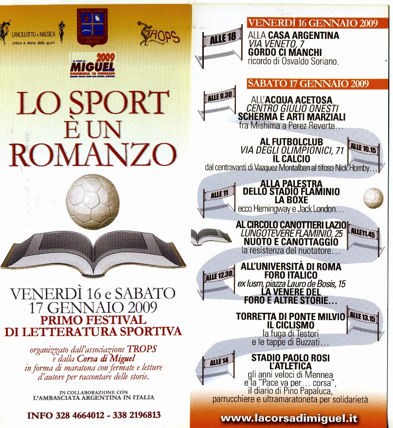 Dalla “Porta che si restringe” di Soriano alla “Solitudine del maratoneta” di Sillitoe, passando per i pugni di Hemingway. E’ il percorso del primo festival di letteratura sportiva “Lo sport è un romanzo” che l’associazione Trops e la Corsa di Miguel, con il patrocinio del XX Municipio, organizzano a Roma per venerdì 16 e sabato 17 gennaio proprio alla vigilia della gara podistica che ricorda la figura del maratoneta‐poeta desaparecido.