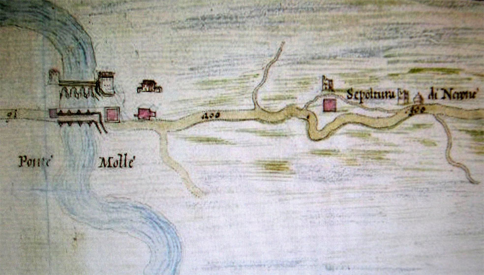 Un altro sito connesso con Nerone è segnalato da Svetonio. Tra la via Salaria e la via Nomentana all’altezza del quarto miglio si trovava la villa di Faonte, un liberto rimasto fedele all’imperatore, che lo aiutò a suicidarsi. Qui fu scoperta un urna marmorea sulla cui fronte l’epigrafe riporta il nome della nutrice dell’imperatore che si volle far seppellire lì, dove il corpo di Nerone fu cremato. Il sito appena menzionato non dista poi molto dalla Cassia; comunque si tratta di una zona del suburbio romano che gia dall’alto medioevo si credeva essere infestata di presenze oscure. Quindi è possibile che la trasmissione di queste tradizioni diffuse nel tempo e nello spazio abbia prodotto una trasposizione di luoghi e avvenimenti finendo per attribuire a Nerone il sepolcro di Vibio Mariano.