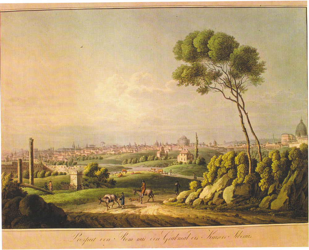 Veduta di Roma dalla via Cassia; acquaforte acquerellata di Johann Friedrich Wizani. Dresda inizi XIX secolo. Esposta alla mostra “Roma, la magnifica visione” fino al 19 Aprile a Palazzo Braschi. www.archeologiaviva.it