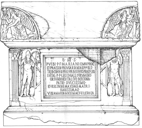 L’iscrizione (CIL VI, 1636) è testimone della realtà storica del monumento, fatto per Publio Vibio Mariano e per sua moglie Regina Massima. A dedicare l’epigrafe, che ripercorre il cursus honorum ossia la carriera militare condotta da Vibio Mariano nel corso della sua vita, fu la figlia Vibia Maria Massima.