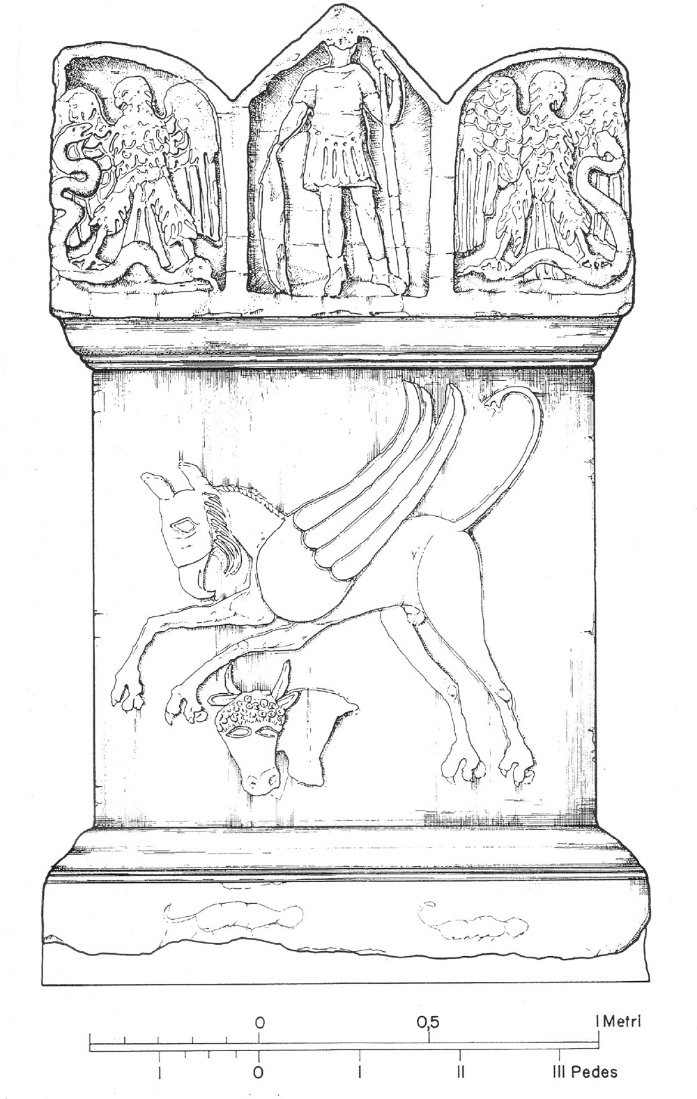 Sul piano semantico quindi la figurazione che si staglia sulla fronte e sul coperchio segue una logica precisa, un filo rosso continuo che utilizzando temi ufficiali di trionfo è volto a celebrare, nel privato, l’apoteosi del defunto, funzionario dell’ordine equestre.