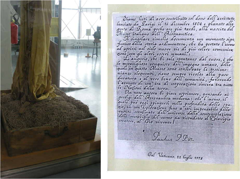 Di questa vicenda si hanno notizie da vari documenti , non per ultimo un libricino del 1927 di Pio Emanuelli, che ripercorre la storia del pallone dopo il suo ammaraggio nel lago. A questo proposito il Tomassetti descrive la diatriba sorta sul recupero dell’ areostato tra Anguillara e Bracciano e che si risolse con il sequestro del “bottino” da parte di Pio VII. Dopo un lungo periodo di permanenza nella Floreria del Vaticano il pallone Garnerin venne donato da papa Paolo VI (Fig. 10) al Museo Storico dell’Aeronautica a Vigna di Valle, dove è tuttora conservato.