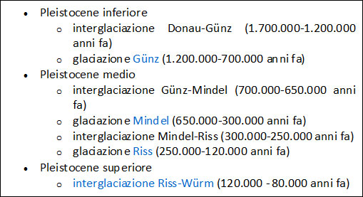 Il Pleistocene è caratterizzato dall’avvicendamento di quattro grandi glaciazioni denominate rispettivamente Günz, Mindel, Riss e Würm, e da quattro cicli interglaciali che crearono nel corso del tempo, un’alternanza di periodi caldi-umidi e freddi-aridi. Queste oscillazioni climatiche favorirono il mutare della flora e della fauna; da foreste rigogliose e ricchi boschi abitati da cervi, daini, elefanti e bisonti si passava a steppe e tundre popolate soprattutto da specie carnivore come la iena, l’orso, la pantera e grandi erbivori come il mammuth. Queste variazione climatico-ambientali portarono all’estinzione di alcune specie e all’adattamento e alla evoluzione di altre che ritroviamo nei vari periodi del Pleistocene. Seguendo la cronologia delle ere geologiche vi descriviamo i ritrovamenti fossili dei mammiferi che popolavano il nostro territorio.