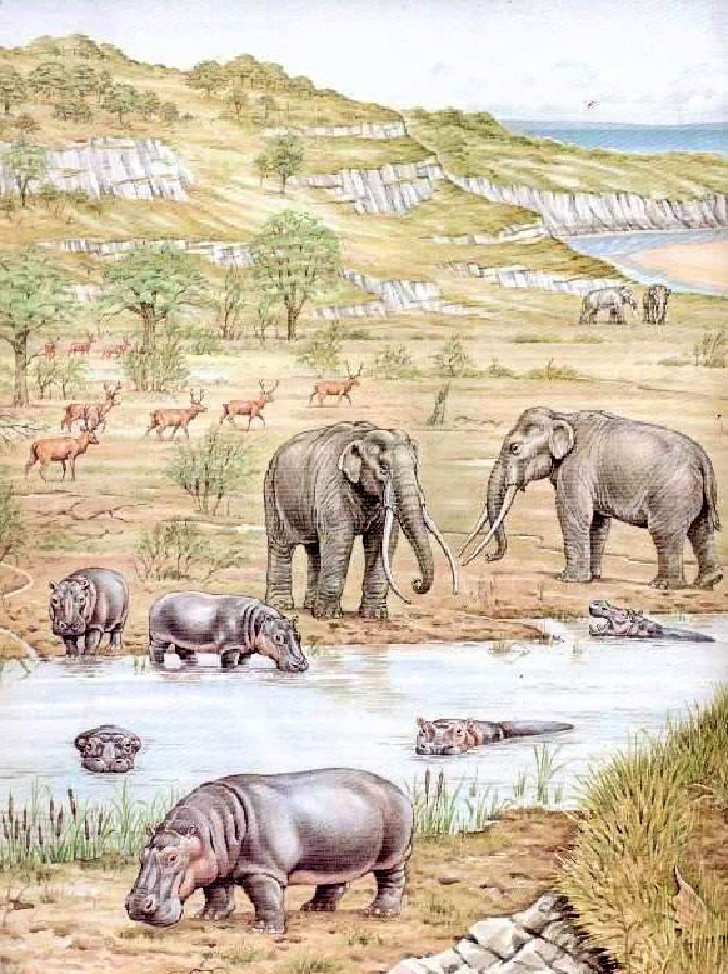 Ipotesi di ambiente del pleistocene medio superiore a Riano con Hippopotamus amphibius, Elephas antuquus e Cervus elaphus (da Sutcliffe 1986)