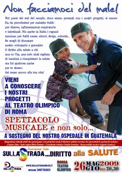 L’associazione “Sulla Strada” informa che ha organizzato per il giorno 26 maggio al Teatro Olimpico lo spettacolo “sulla strada, diritto a….”, una manifestazione di musica e comicita’ allo scopo di veicolare, attraverso allegria e buona musica, temi sociali quali solidarieta’, sobrieta’ nello stile di vita e impegno personale. Scopo della manifestazione e’ naturalmente anche il finanziamento di un progetto a sostegno della popolazione maya del Guatemala.