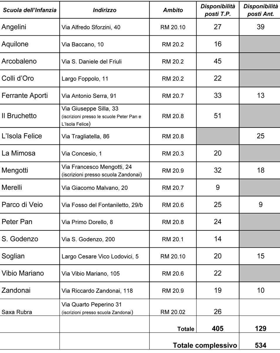 Per quanto attiene al nostro territorio, il XX Municipio ha reso noto l’elenco delle scuole di competenza e della relativa disponibilità con un avviso sul sito istituzionale, con l’avvertenza che l’indicazione del numero dei posti è indicativa e suscettibile di variazioni (clicca qui).