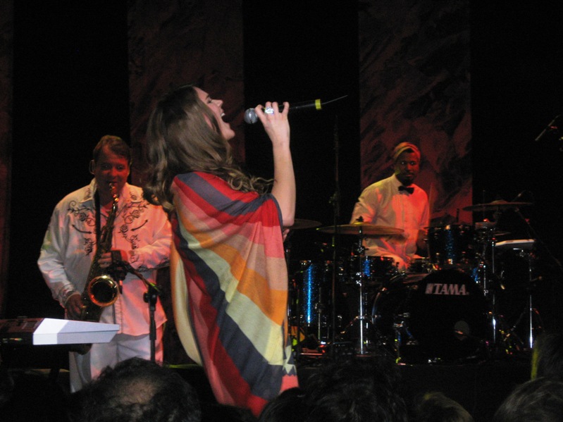 Accecata dai fari, non riesce a vedere il pubblico che è seduto compostamente nelle accoglienti poltrone rosse della sala da concerto. Dice di vedere “tutto nero” ed invita gli spettatori ad alzarsi e a farsi più vicino.