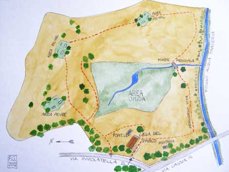 Il Parco, se e quando si farà, verrà realizzato in quell’ampia distesa dove attualmente pascolano cavali ed asini e si estenderà fino alla sommità della collina confinando con i terreni affittati da un pastore. Sul lato a sud il parco si fermerà invece in prossimità del Fosso dell’Acqua Traversa.