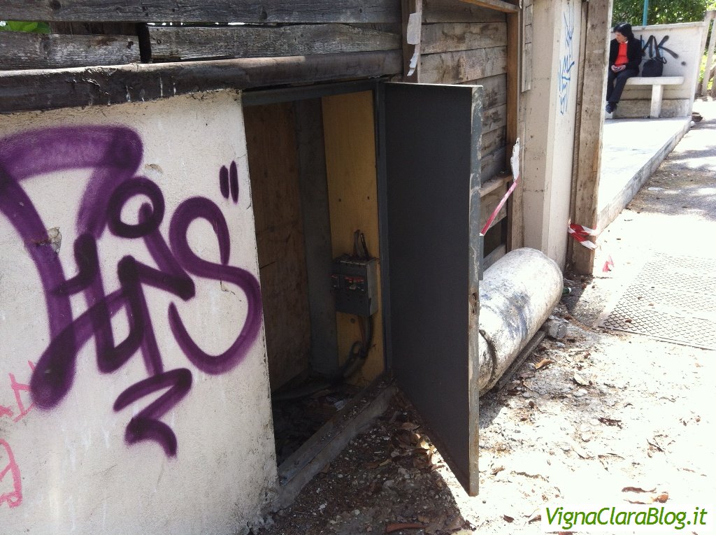 Su piazzale Ronciglione, a destra della scalinata, assi malmesse di legno dovrebbero impedire di cadere nelle erbacce. A sinistra invece, una recinzione in legno facilmente ma pericolosamente aggirabile nasconde alla vista vecchi attrezzi meccanici, forse abbandonati dalla ditta che anni fa fece la ristrutturazione. Ma non basta.