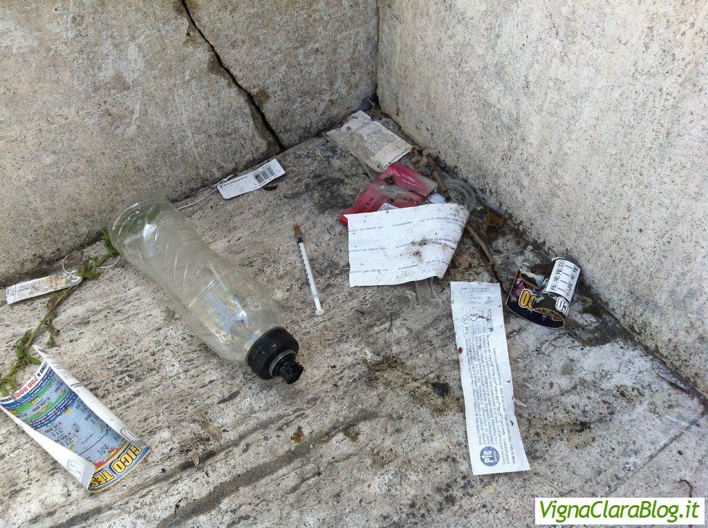 Imitando il protagonista di quella scena finale de “Il Giovedì” impegniamo i gradini da Corso Francia in su, verso via Ronciglione, a due a due, ma alla prima piazzola ci dobbiamo arrestare. Ai due lati, ecco delle siringhe.