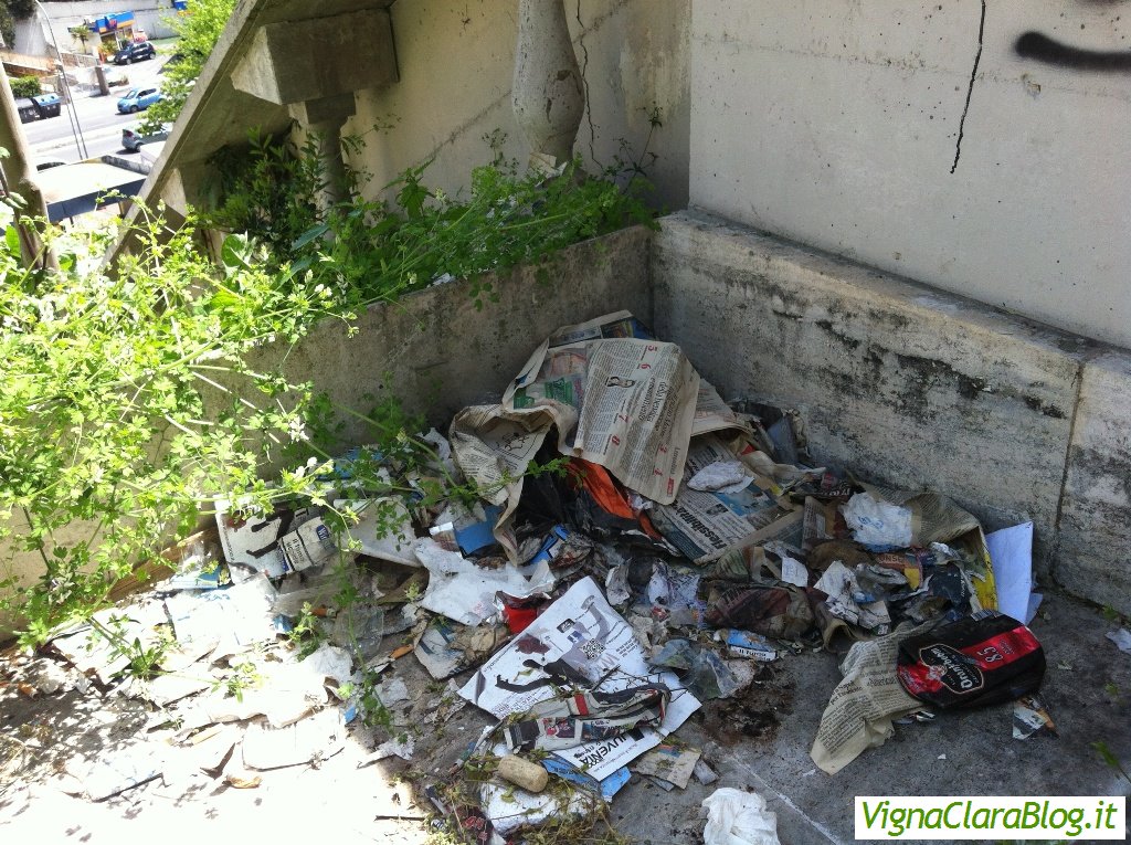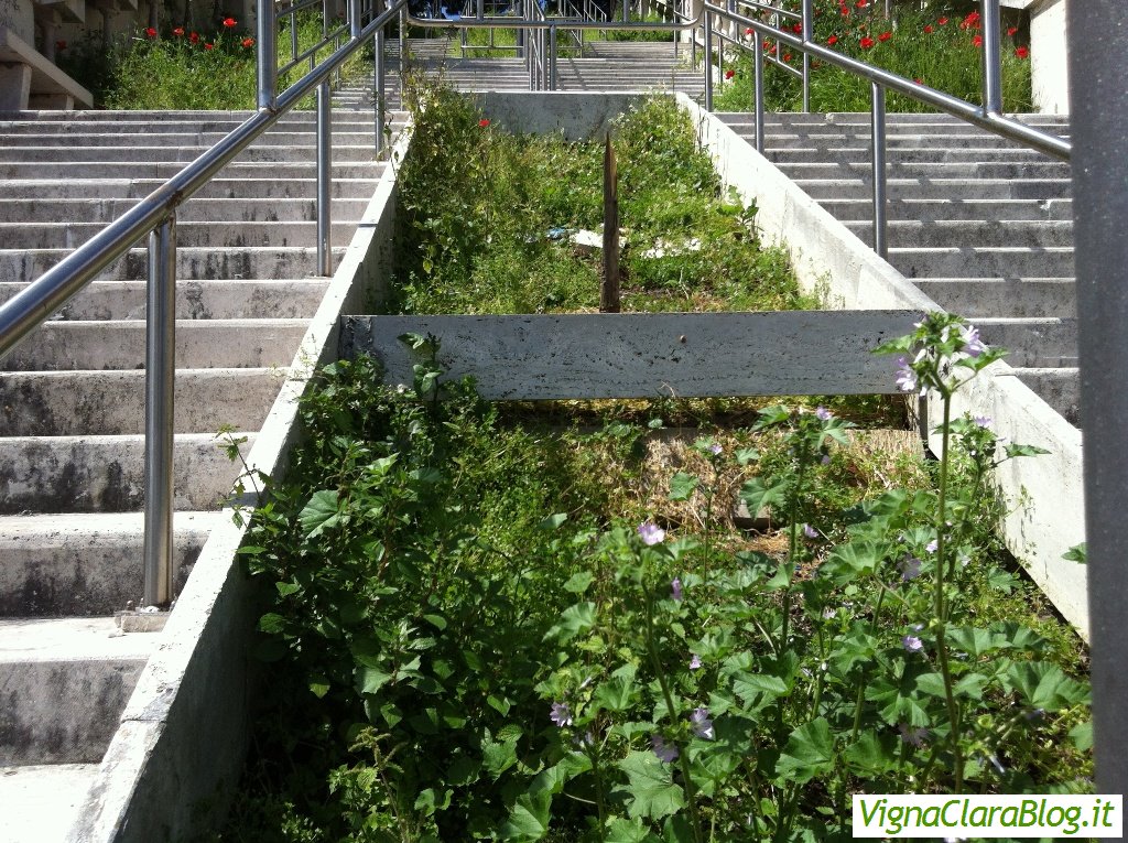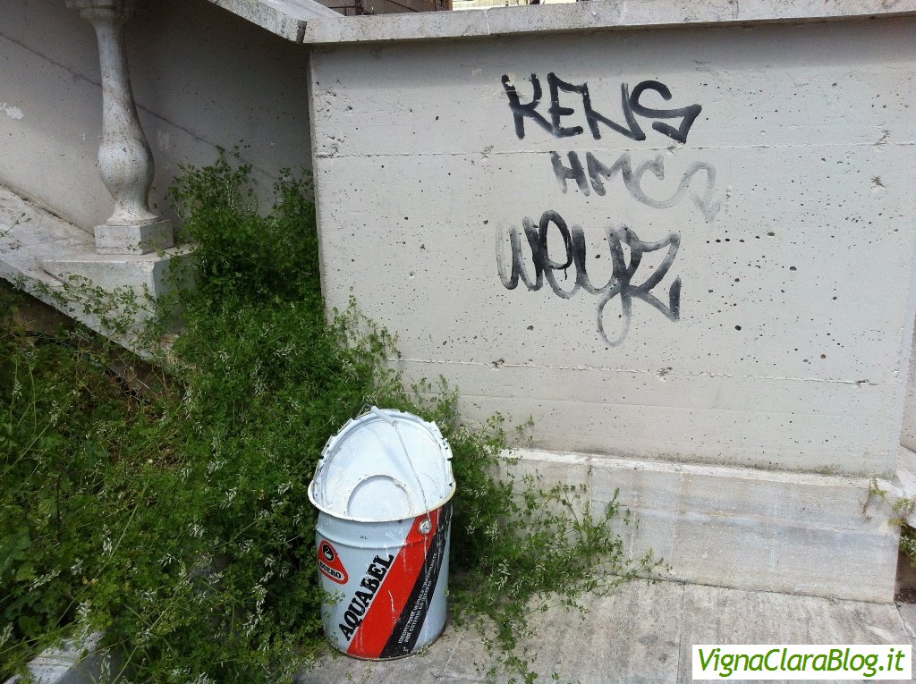 Altra rampa altra scena. Un bidone di vernice abbandonato, aiuole prive di terra ma in compenso colme di erbacce, e tanta sporcizia, cartacce, fogli di giornali, pubblicità, lattine. I cultori della differenziata ci andrebbero a nozze. E che dire dei graffiti? Ce ne sono a iosa.