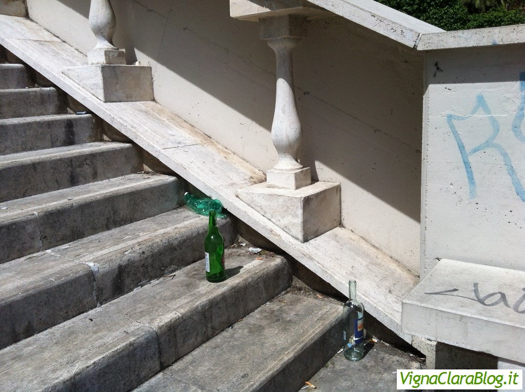 Centocinquantasette gradini congiungono Corso Francia a via Ronciglione. Ogni ventina una piazzola, ogni piazzola bottiglie, rifiuti, sporcizia. E siringhe. Si percepisce al volo che la manutenzione è inesistente su questa scala immortalata da Dino Risi nella scena finale del suo film “Il Giovedì” del 1963. Sarà da allora che non viene più pulita?