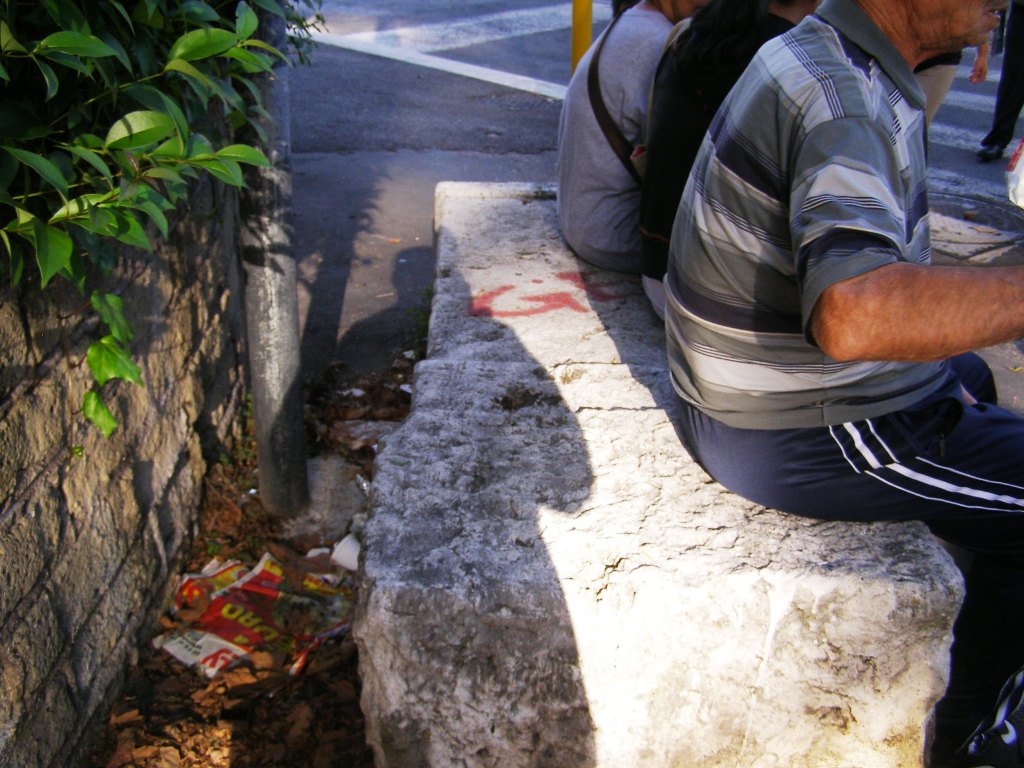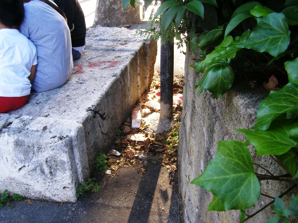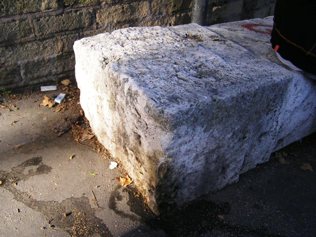 L’anziano signore che ci sta seduto sopra ci dice di avere 85 anni e che almeno da trenta ricorda il cippo in quella posizione; anche una passante, una signora di mezza età, ci dice che quando frequentava le scuole medie il grande marmo era già coricato.