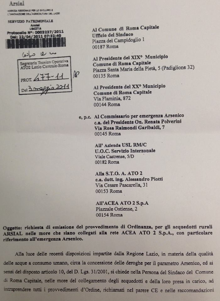 Si tratta della fotocopia di una lettera inviata dall’Arsial con la quale si chiede esplicitamente “l’emissione del provvedimento di ordinanza per gli acquedotti rurali Arsial nelle more che siano collegati alla rete Acea Ato 3 Spa, con particolare riferimento all’emergenza arsenico”.