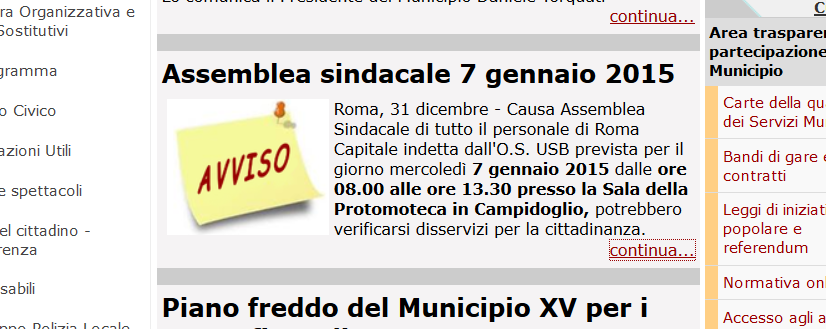 Il Campidoglio vieta l’assemblea dei dipendenti organizzata dall’Usb per mercoledì 7 gennaio. E’ troppo lunga ed è stata richiesta solo oggi 5 gennaio, queste le motivazioni. Una delle due però è in contraddizione col fatto che GIà fin dal 31 dicembre sul sito web di alcuni municipi (vedi esempio XV) si avvertono i cittadini dei possibili disagi dovuti all’assemblea.