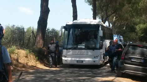 Ma puntuale, alle 12:55, fra le proteste e i tentativi di blocco arriva il pullman con i profughi scortati da poliziotti in tenuta anti sommossa. Il mezzo è arrivato sula rotonda dalla quale inizia il viale che conduce fino alla scuola Socrate.