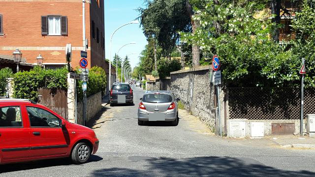 Mentre siamo intenti a capire la situazione, davanti a noi si materializzano due vetture; una che scende e una che sale da via Cassia, si immettono entrambe su via di Santa Giovanna Elisabetta. Impossibile vederle con anticipo perché da entrambi i lati la visuale è impedita dalle mura delle abitazioni. La prima, quella che veniva da destra, frena di colpo e la seconda fa lo stesso.