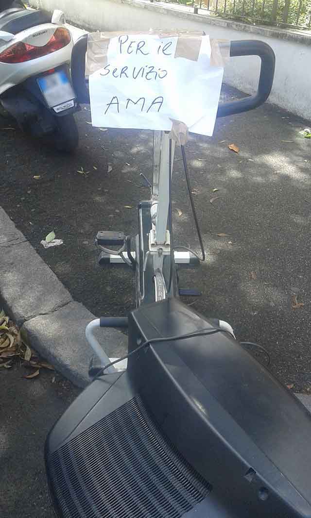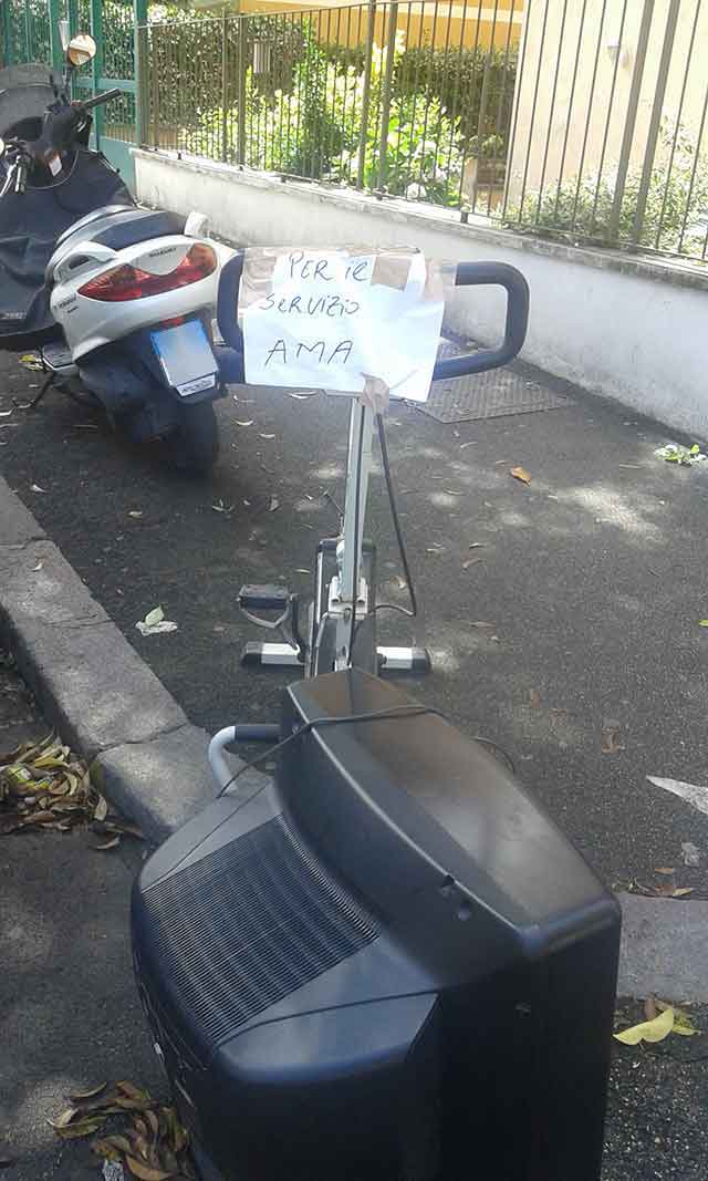 La raccolta differenziata secondo alcuni romani si fa così. In via della Farnesina, all’altezza del civico 7 (50 metri da Ponte Milvio), nella notte tra lunedì e martedì 17 maggio un ignoto e ignorante cittadino ha pensato bene di abbandonare sul marciapiede una cyclette ed un televisore apponendo un cartello sul quale aveva scritto a lettere maiuscole “PER IL SERVIZIO AMA”.