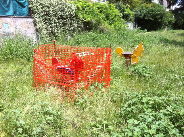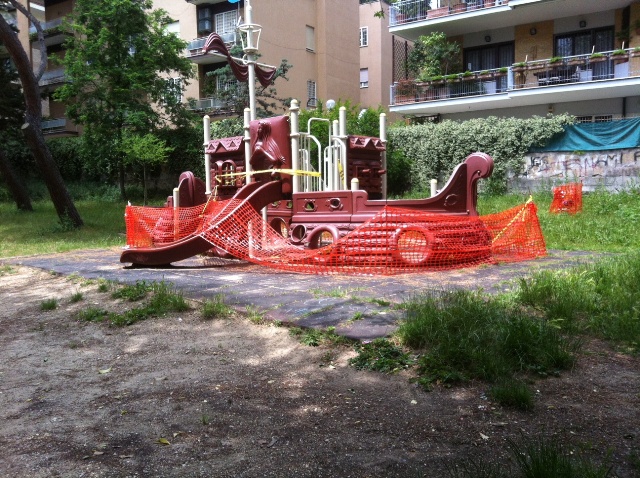 Quel brutto castello di plastica, regalo di un Dipartimento all’Ambiente che ha così a cuore l’ambiente tanto da posizionare una quintalata di plastica in un’area verde – regalo avvenuto nel lontano ottobre 2010 – non è più praticabile da mesi. Diventato probabilmente insicuro ora è addirittura inutilizzabile perchè transennato.