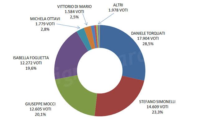 Scrutinate tutte le 144 sezioni, il risultato finale conferma le proiezioni delle prime ore di questa mattina. Daniele Torquati, minisindaco uscente e candidato PD per il centrosinistra, si posiziona al primo posto con complessivamente 16.528 voti (sommatoria delle liste) pari al 27,96%.
