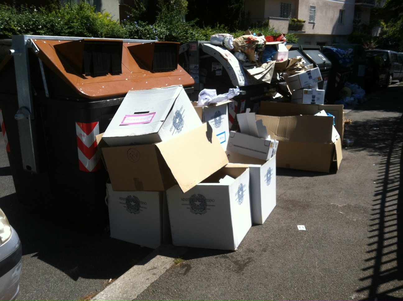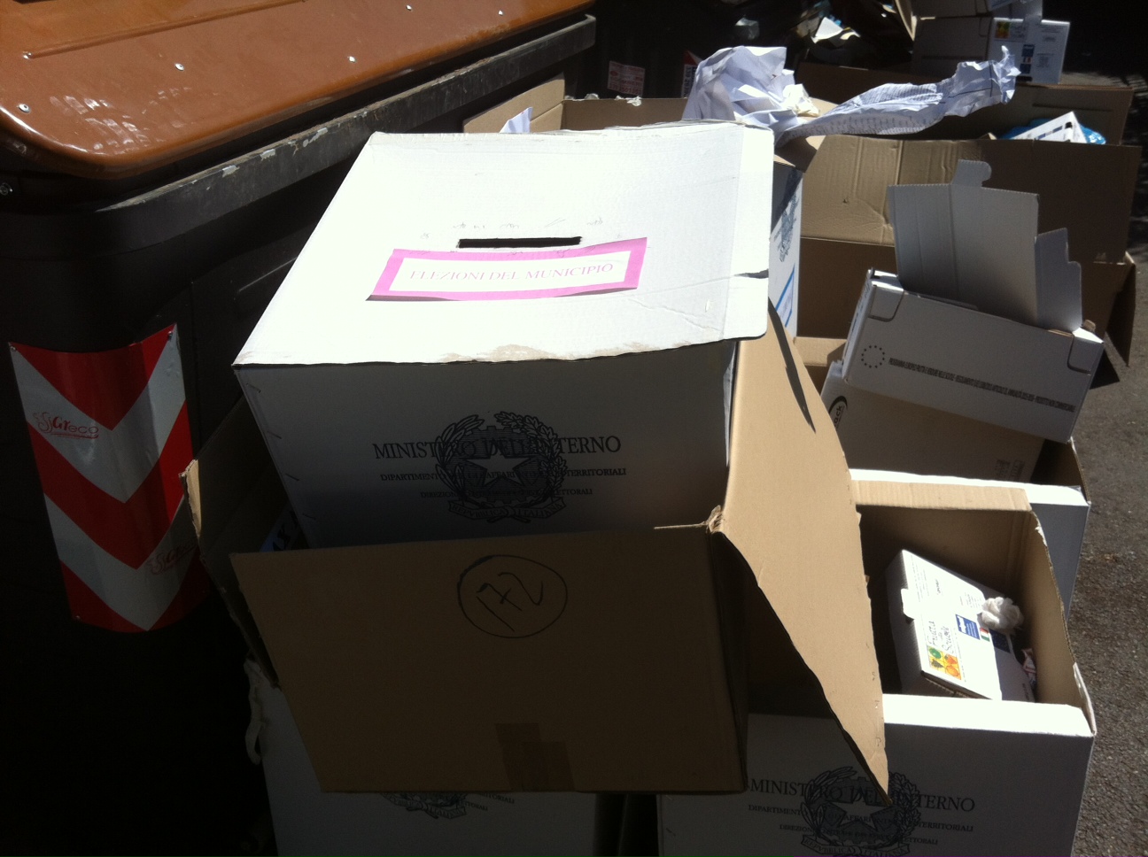 Terminato lo spoglio e chiuso il seggio alcuni scrutatori delle sezioni di via Mengotti, a Vigna Clara, hanno ritenuto che abbandonare sul marciapiede di fronte la scuola urne, tabelloni elettorali e appunti fosse il metodo più semplice per concludere il loro lavoro.