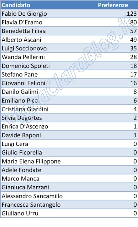 Ecco le preferenze. Si invita a fare attenzione, i dati che seguono sono da ritenersi del tutto ufficiosi. Quand’anche siano stati resi pubblici nei locali del Seggio Centrale, fino a formale proclamazione essi hanno valore puramente indicativo e chiunque ne faccia uso per fini diversi da quelli unicamente informativi a cui sono destinati dalla nostra testata ne è direttamente responsabile.