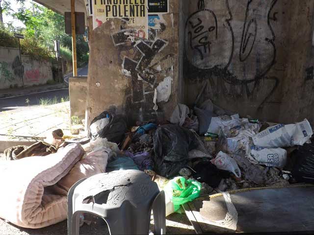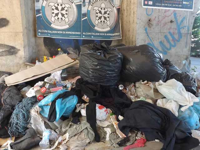 I rifiuti invadono letteralmente il parcheggio, bustoni d’immondizia occupano non solo i posti auto ma anche la strada e le insenature delle colonne in cemento armato, peraltro tappezzate da manifesti abusivi. Uno spettacolo indecente.