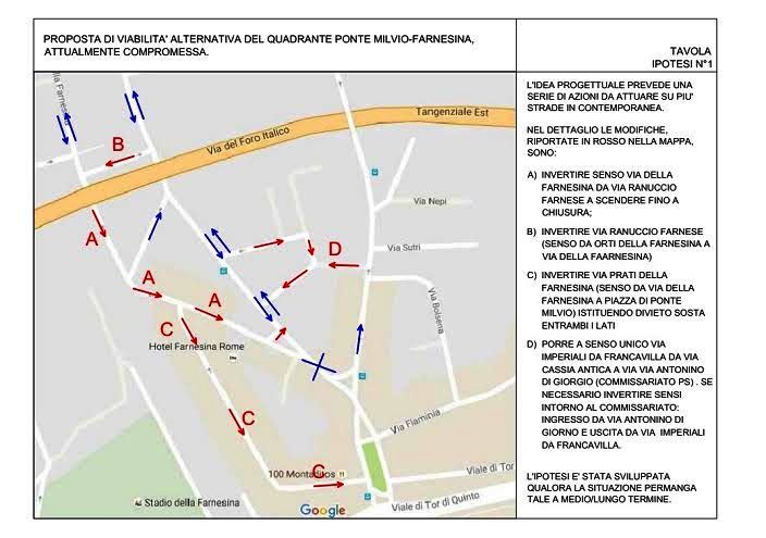 Infine, invertire il senso di marcia di via Ranuccio Farnese e quello di via della Farnesina, da quest’ultima fino a Ponte Milvio.