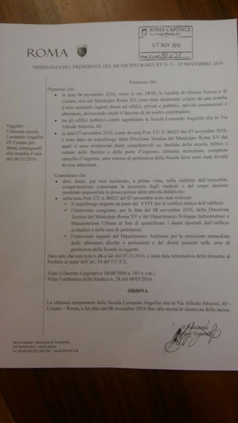E’ quanto si apprende dall’ordinanza emessa dal presidente del XV Municipio, Stefano Simonelli, considerato che i danni arrecati dal tornado scatenatosi nel pomeriggio di domenica 6 novembre, pur non incidendo a prima vista sulla stabilità dell’edificio, compromettono comunque la sicurezza degli studenti e del corpo docente rendendo impossibile la normale prosecuzione delle attività didattiche.
