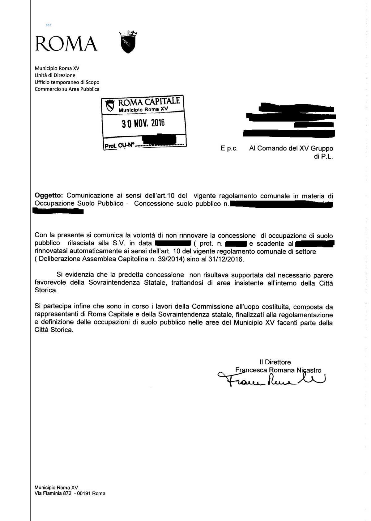 Parole testuali della missiva firmata XV Municipio giunta a wine-bar, ristoranti e bar con tavolini all’aperto.