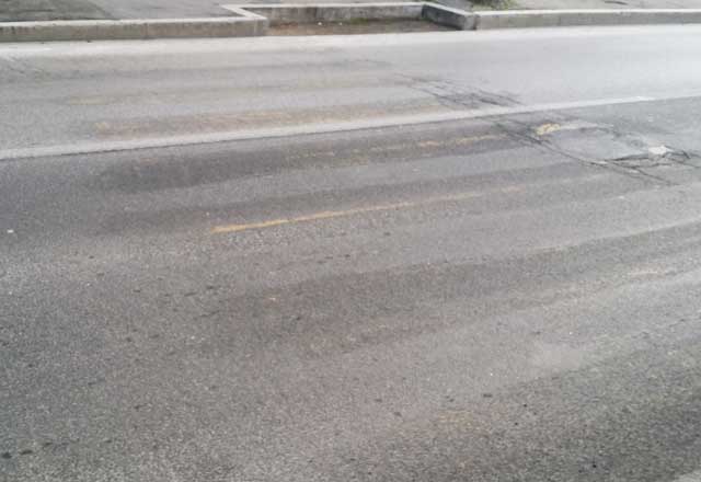 Si tratta di strisce gialle – quindi dovute presumibilmente a lavori su strada fatti di recente – quasi del tutto cancellate, stavolta non dagli elementi ma dalla mano dell’uomo.