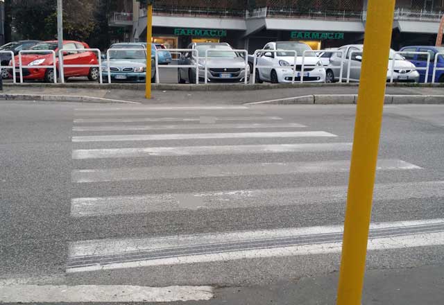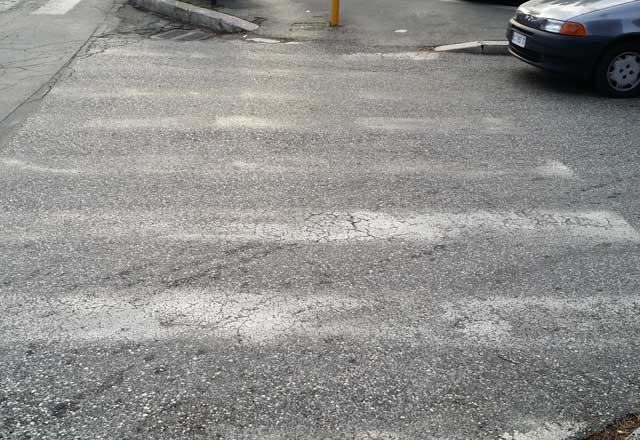 Però la cancellazione ha lasciato l’impronta delle vecchie strisce, oltre a qualche residuo di giallo dall’ormai debole vigore cromatico, e pertanto può indurre in errore i pedoni.