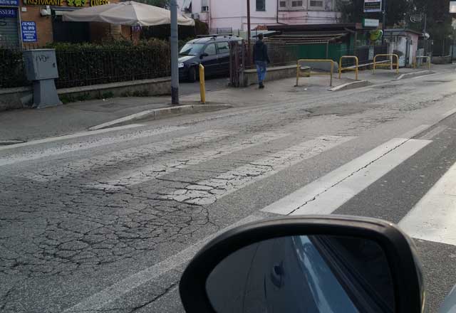 Anche più avanti, in zona Tomba di Nerone all’altezza del civico 639, le strisce sono poco visibili. E non siamo in corrispondenza di un semaforo o di uno stop, pertanto i pedoni possono solo sperare che chi è alla guida abbia una buona vista.
