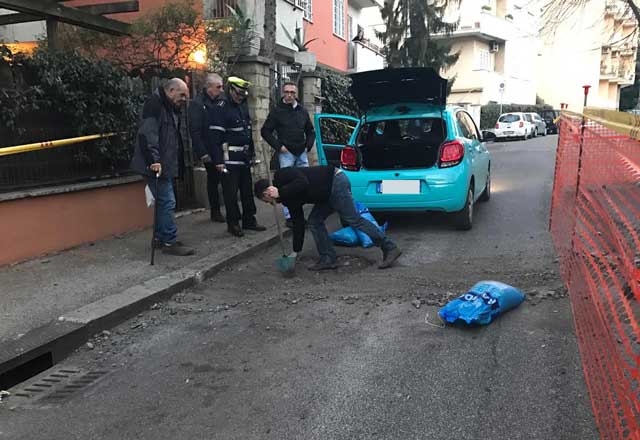 Poi, verso le 17.30, l’intervento di alcuni impiegati del Municipio XV (sì, impiegati!) che, pale alla mano, hanno colmato la buca con dell’asfalto a presa rapida, ha consentito la rimozione del blocco stradale ripristinando la normale viabilità.