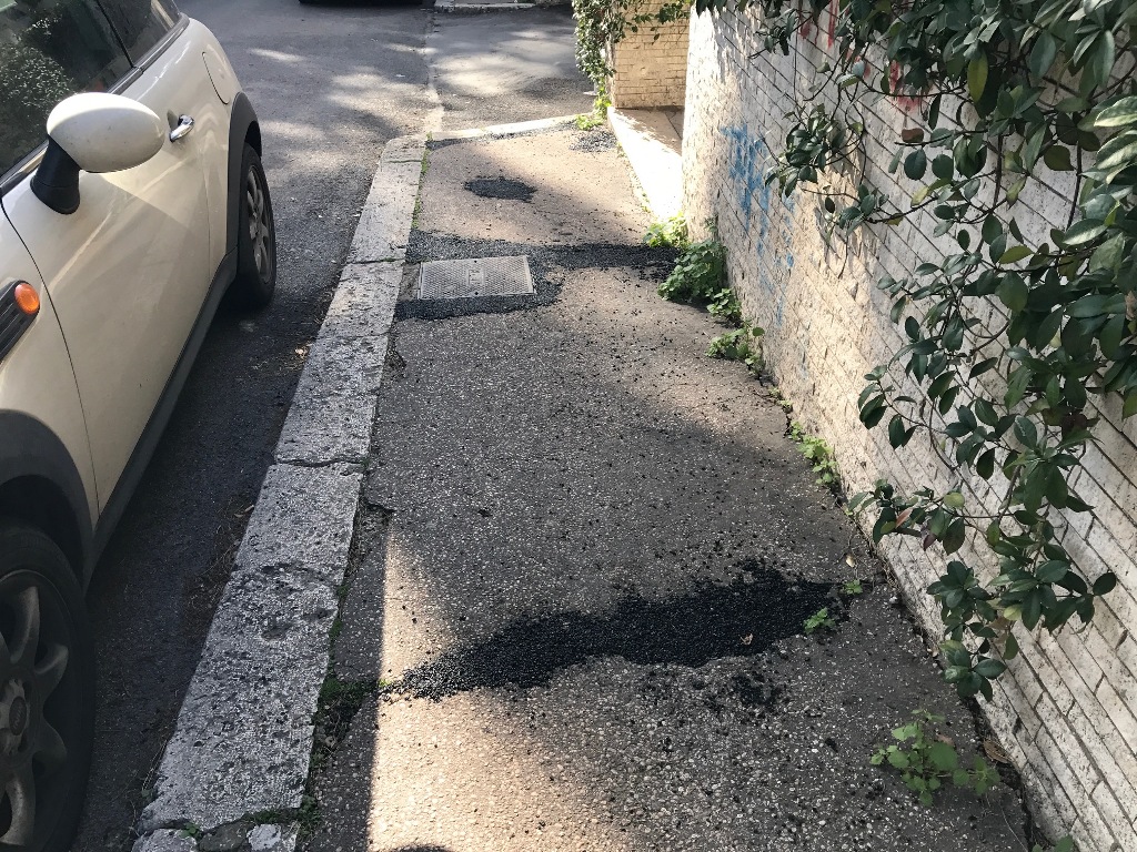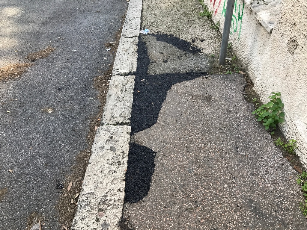 1. Stessa cosa hanno fatto in via della Farnesina difronte all’asilo nido, toppa messa ad ottobre dalla Acea dopo una riparazione dopo pochi giorni l’asfalto ha cominciato a sgretolarsi, ad oggi c’è rimasto il vecchio asfalto grattugiato, scritta e-mail al XV municipio ma nessuna risposta