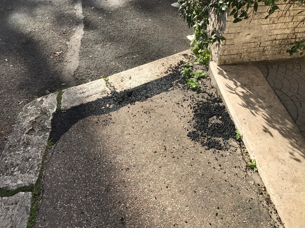 Poi continuano il loro lavoro spargendo catrame, come fossero seminatori di grano, sui marciapiedi dell’attigua via del Podismo lasciandoli in tal modo.