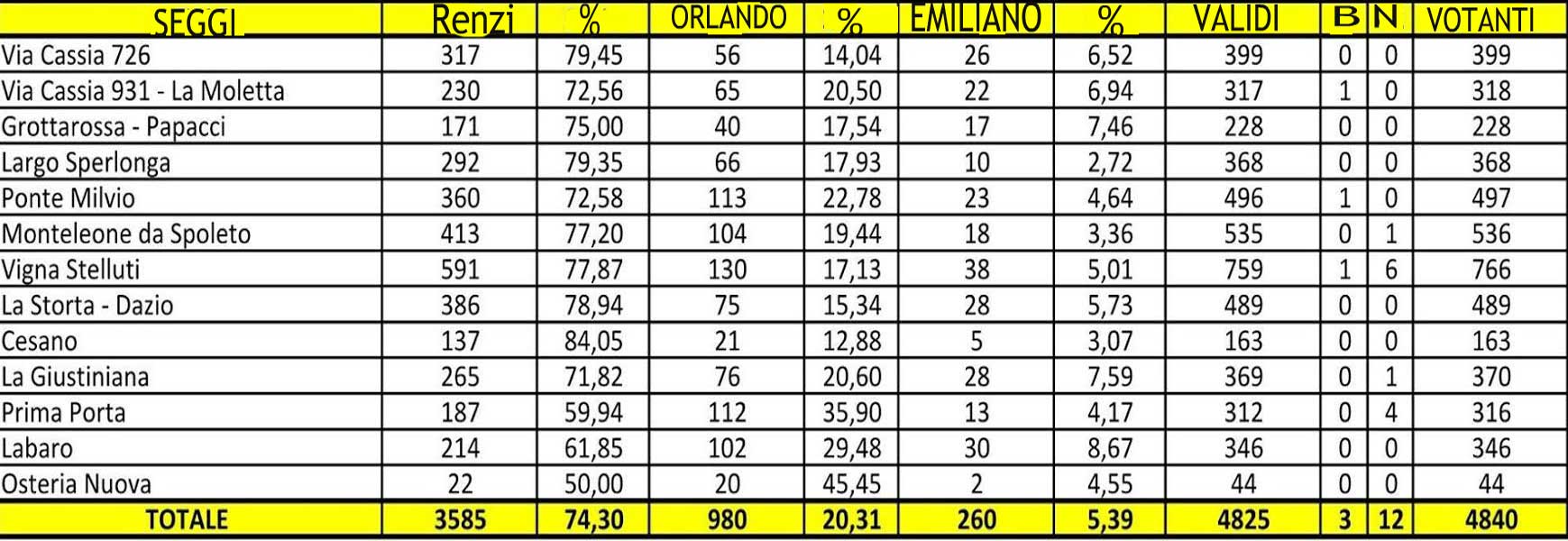 Il miglior risultato di Renzi è a Cesano dove ha raccolto l’84% dei voti mentre il peggiore è stato registrato a pochissima distanza, in quel di Osteria Nuova, dove invece si è fermato al 50% tallonato da Orlando al 45,5%.