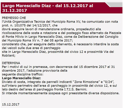 Motivo? Svelato subito l’arcano: in tale periodo l’Unità Organizzativa Tecnica del Municipio XV “dovrà eseguire lavori di manutenzione ordinaria, propedeutici alla ricollocazione delle soste a rotazione e del posteggio fisso alternato da Piazzale di Ponte Milvio in Largo Maresciallo Diaz, come da Deliberazione del Consiglio del Municipio Roma XV n. 7 del 05 aprile 2017“.